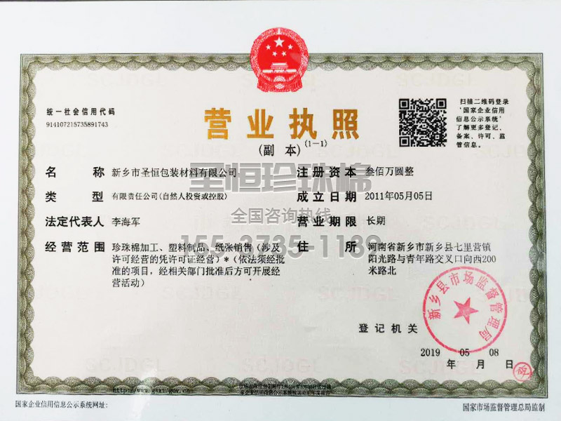 新乡市圣恒包装材料有限公司是一家以经营塑料包装材料为主的生产加工型企业,公司位于河南省新乡市,注册资金为300万人民币。拥有珍珠棉两条发泡线,主要经营EPE珍珠棉卷棉0.3---10mm、珍珠棉板材10--100mm,木地板防潮垫、珍珠棉复铝膜等产品。